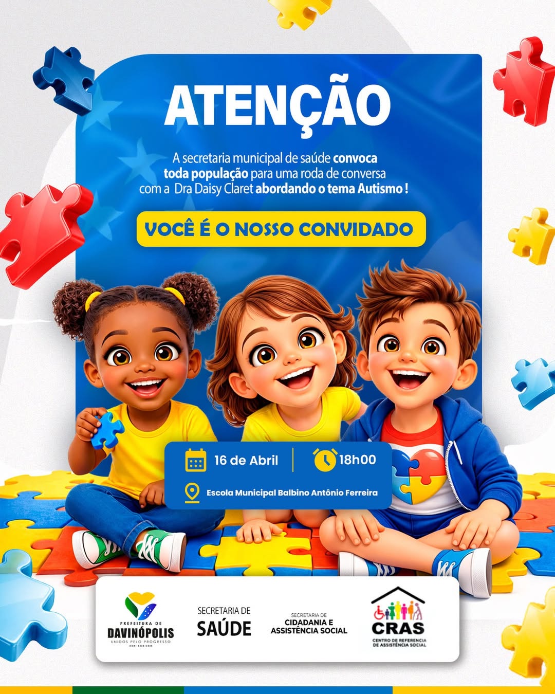 A Prefeitura de Davinópolis, por meio da Secretaria Municipal de Saúde, convida toda a população para uma roda de conversa sobre o autismo, com a Dra. Daisy Claret. Um espaço para aprender, tirar dúvidas e fortalecer o cuidado com as nossas crianças e famílias.
